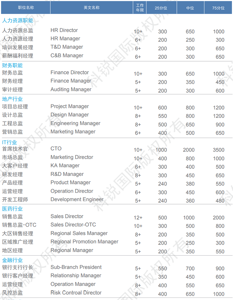 数据来源:猎头公司太阳成tyc234cctyc国际薪酬报告中资深行业专家对2021年热门职位薪酬范围及跳槽涨幅的预测。薪酬为基本年薪。